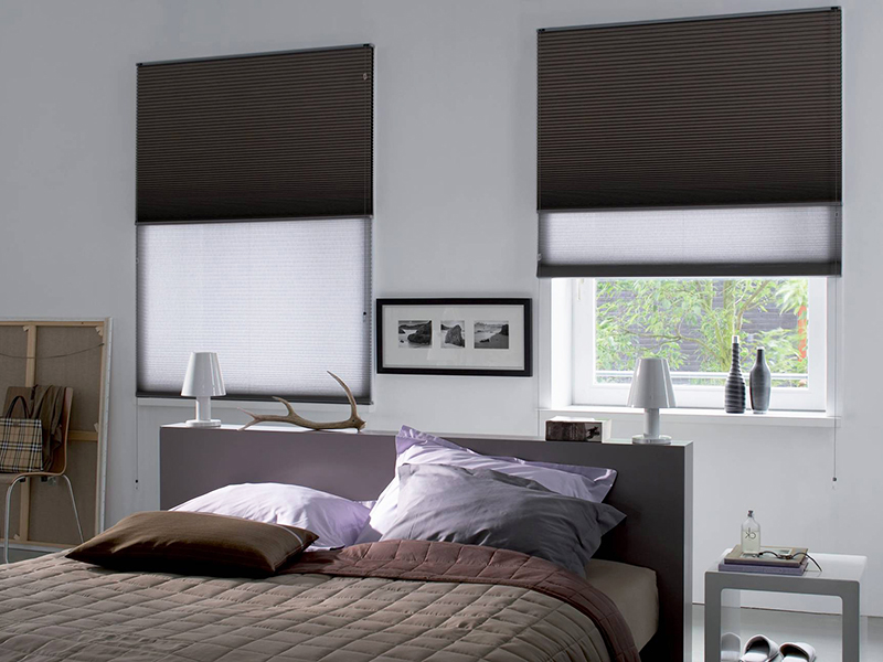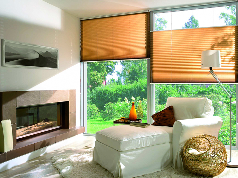 - Гофрированные шторы или жалюзи двойное плиссе – излюбленный вариант дизайнеров. Такая конструкция состоит из отдельных отсеков и обеспечивает защиту не только от солнечного света, но и от нагревания.